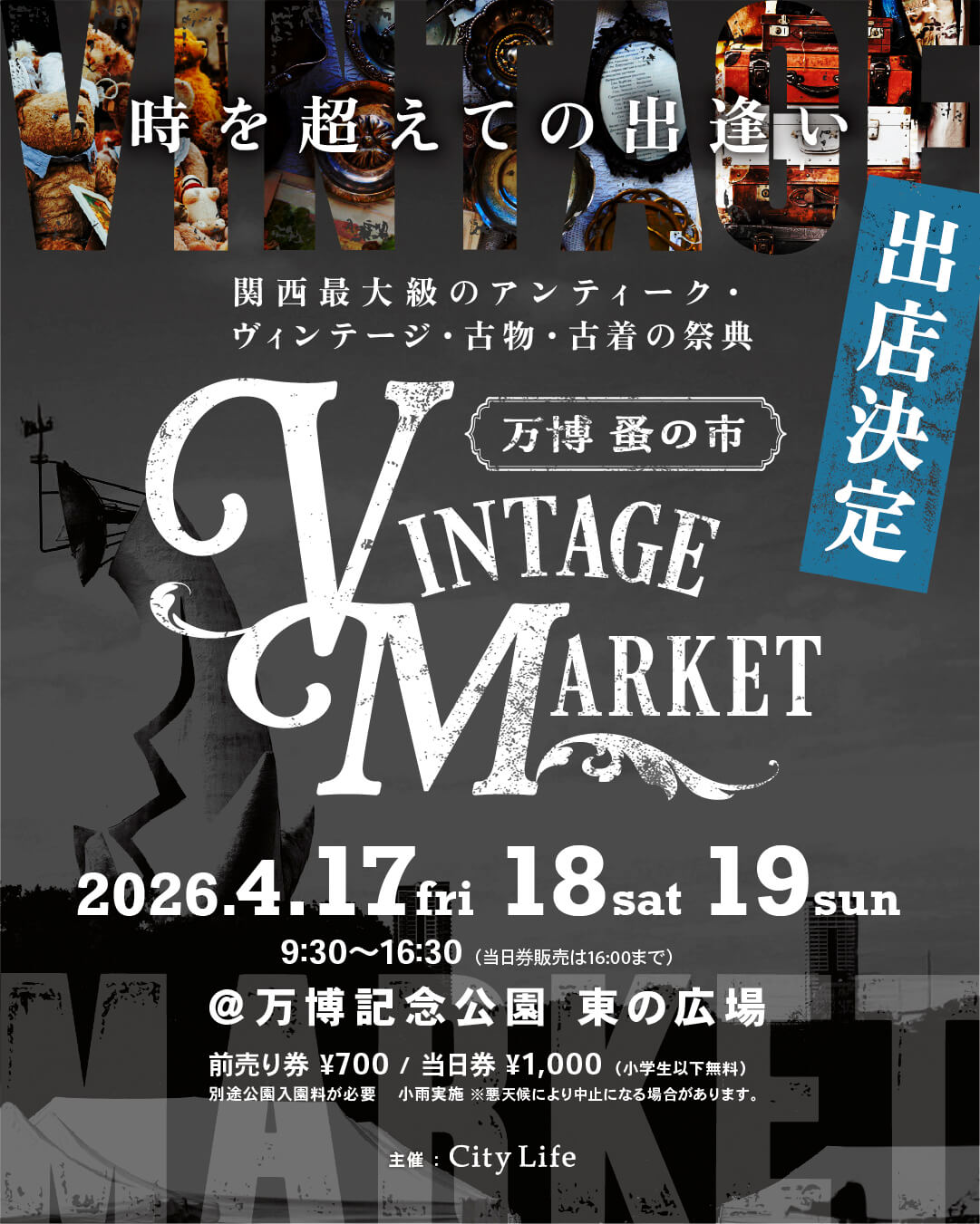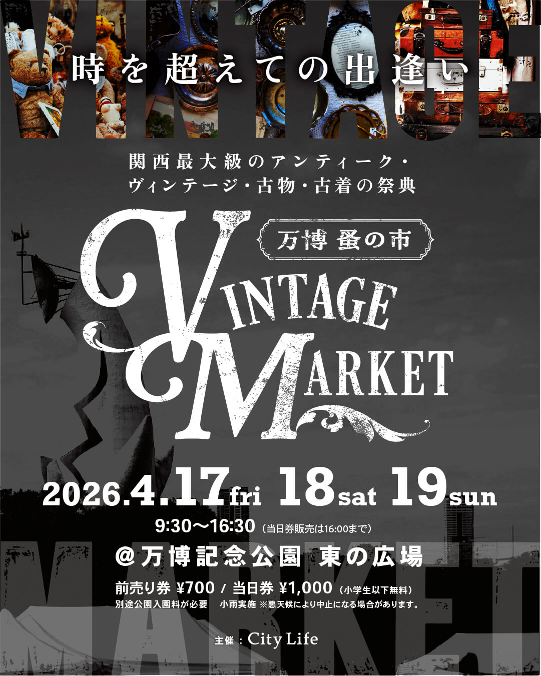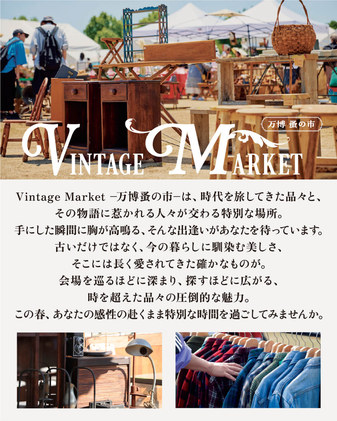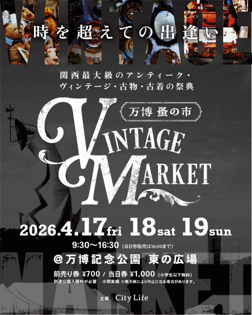 / 過去最大規模で開催!約200店が軒を連ねる VintageMarket−万博蚤の市− 2026.4.17-19 @万博記念公園 \ ・ Vintage Market-万博蚤の市-は、時代を旅してきた品々と、その物語に心惹かれる人々が集う、関西最大級のアンティーク&ヴィンテージマーケットです。 会場には約200店ものショップが軒を連ね、アンティーク、ヴィンテージ、古着に特化した選りすぐりの品々が並びます。 家具や雑貨、器、ジュエリー、ファッションまで、ジャンルを越えて“本物”と出会える贅沢な空間が広がります。 舞台となるのは、太陽の塔の横顔を望める万博記念公園。 広々とした緑の中で、時を超えて受け継がれてきた品々を手に取る体験は、ここでしか味わえない特別なひとときです。 手にした瞬間、理由もなく胸が高鳴る。 そんな出逢いが、このマーケットには確かに存在します。 古いだけではなく、今の暮らしに自然と溶け込み、これからの時間を共に過ごしていけるものばかりです。 会場では心地よいJAZZ演奏が流れ、空間に豊かなリズムと余韻を添えます。 さらに、思わず写真に収めたくなるような映えるフードも充実。 買い物だけでなく、音楽や食とともに五感で楽しめるのもVintage Market-万博蚤の市-ならではの魅力です。 歩くほどに深まり、巡るほどに広がるヴィンテージの世界。 この春、あなたの感性に正直に、時を超える出会いを探しに来てみませんか。 ・ ●Vintage Market -万博 蚤の市-2026春 ●開催日:2026.4.17(金)~ 19(日) ●時間:9:30~16:30 ※当日入場券販売は16:00まで ●場所:万博記念公園 東の広場 ●入場料:前売り券 700円、当日券 1,000円(小学生以下無料) ※前売り券は絶賛発売中。 ※別途公園入園料が必要 ●小雨実施、悪天候により中止になる場合があります。