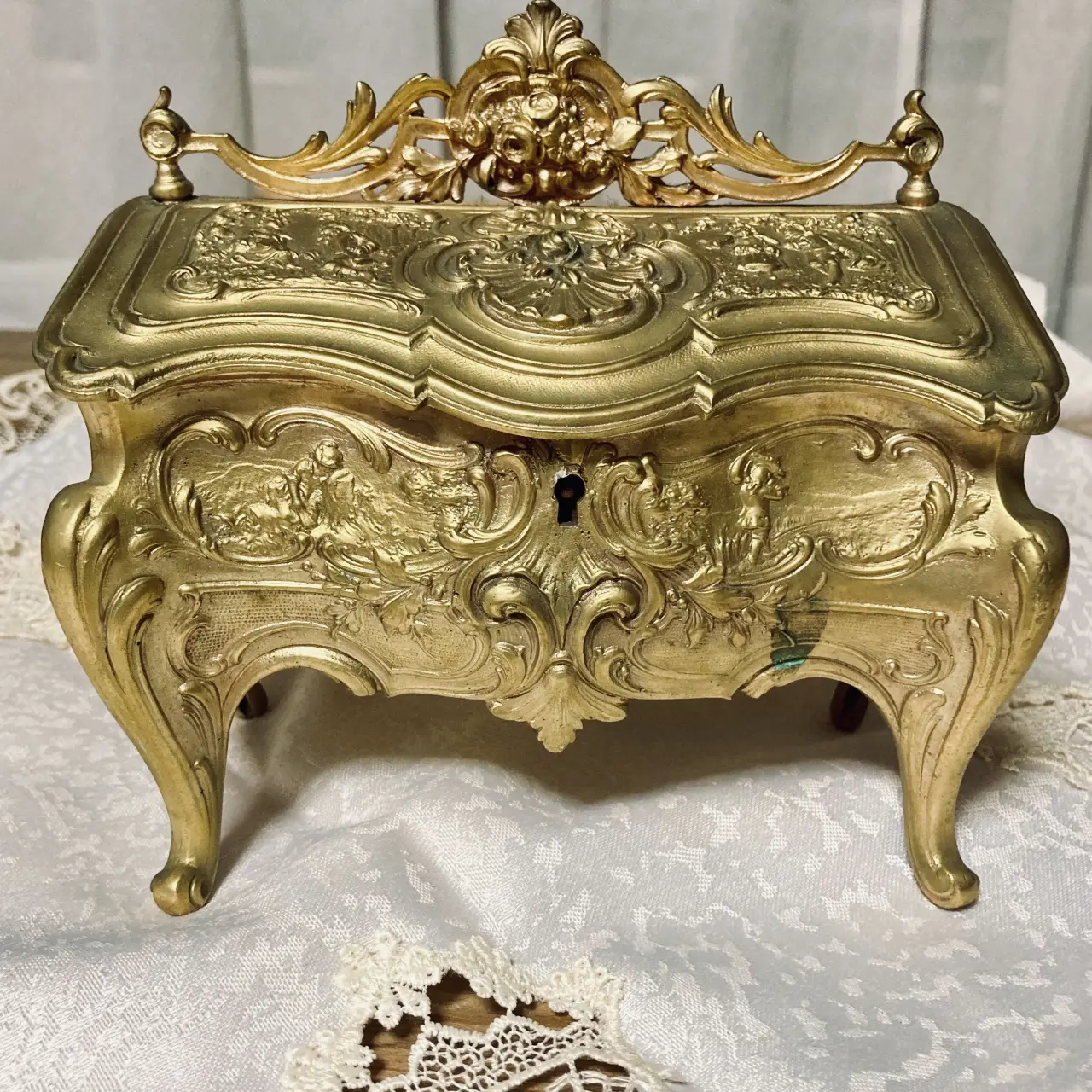 • Made in FranceAntique Jewelry Boxフランス製アンティーク ルイ15世様式ジュエリーボックス19世紀後半1850年~1900年代頃素材:ギルトメタル(真鍮やブロンズに金メッキを施したもの)曲線的なフォルムと豪華で流れるようなロカイユ装飾(貝殻や植物をモチーフにした非対称なデザイン)が特徴。レリーフ(浮き彫り)やガブリオールレッグ(猫脚)のデザインとロココ調様式が特徴です。