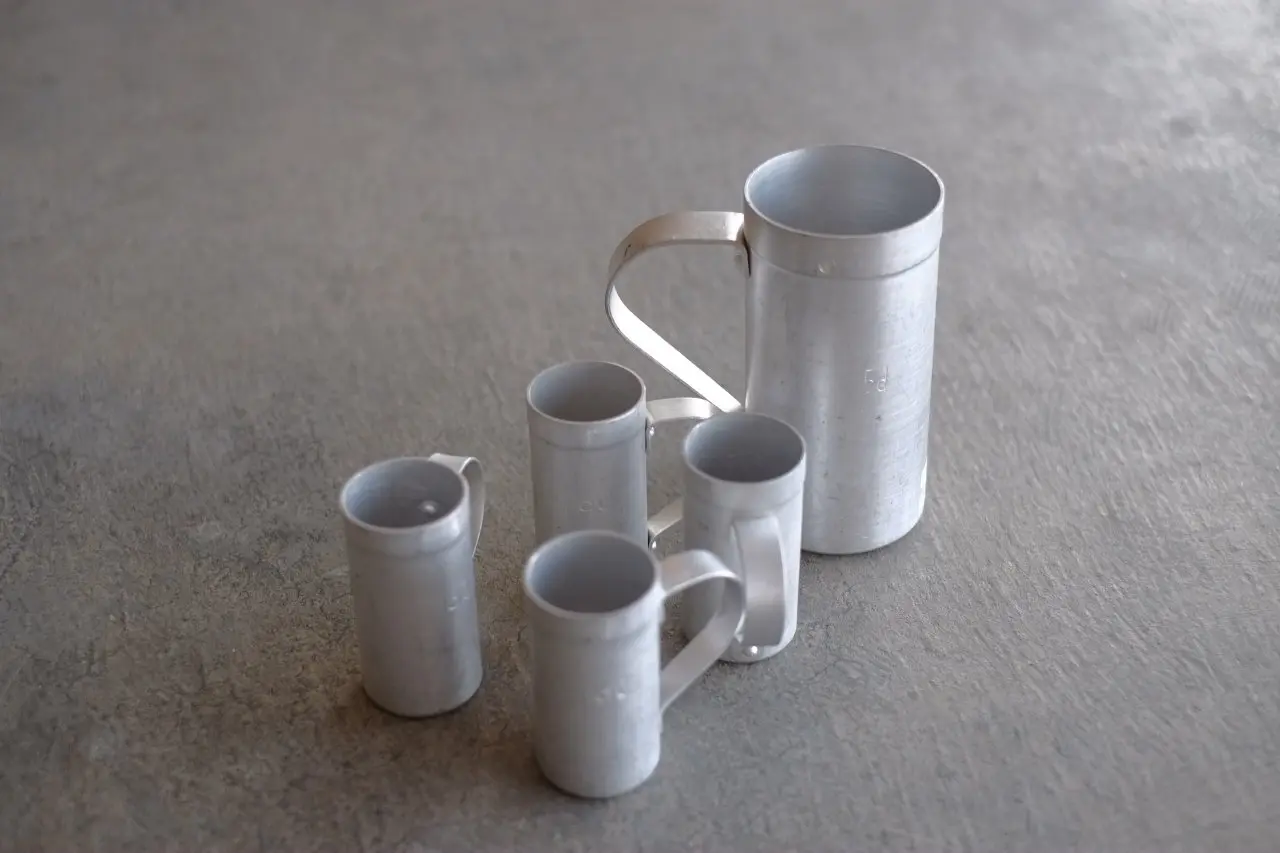 • アルミの計量カップ使い込まれた経年変化の美しいアルミ軽量カップは、一輪挿しにもおすすめです。(Italy,1960年代)